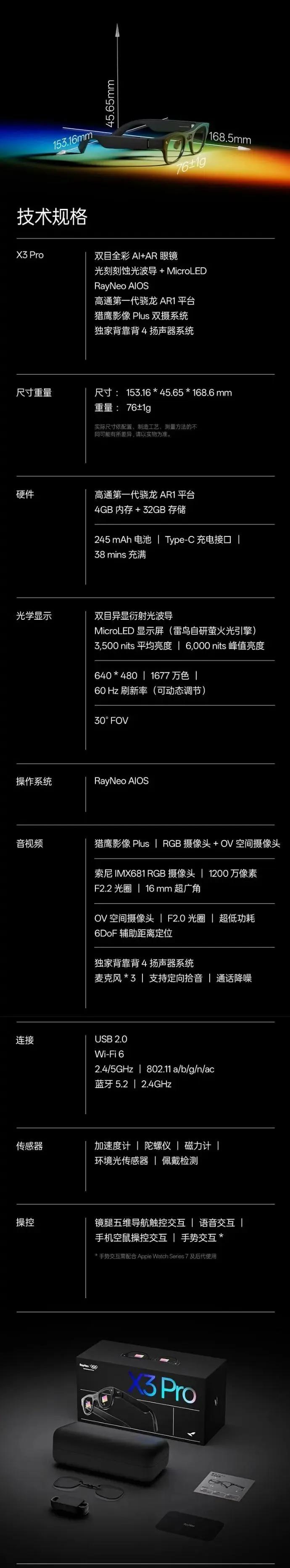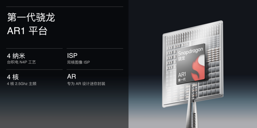 该眼镜基于骁龙 AR1 平台打造,号称是首款由 AR1 驱动画面显示的眼镜;搭配 4GB + 32GB 存储,低功耗蓝牙 5.3 和高传输 Wi-Fi 6。