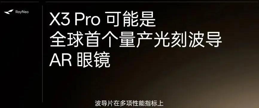 雷鸟 X3 Pro 还采用了新一代二维扩瞳衍射光波导镜片,基于玻璃镜片材质,采用纳米光刻刻蚀工艺,实现了光效率提升 25%,镜片重量下降 25%, 镜片厚度减少 6mm,在显示上等效 43 寸透明屏幕。