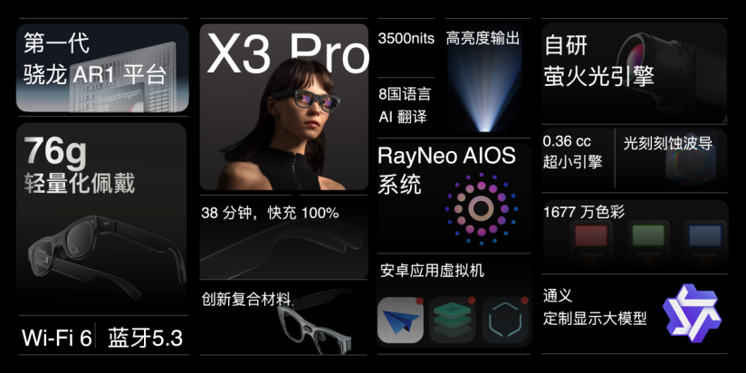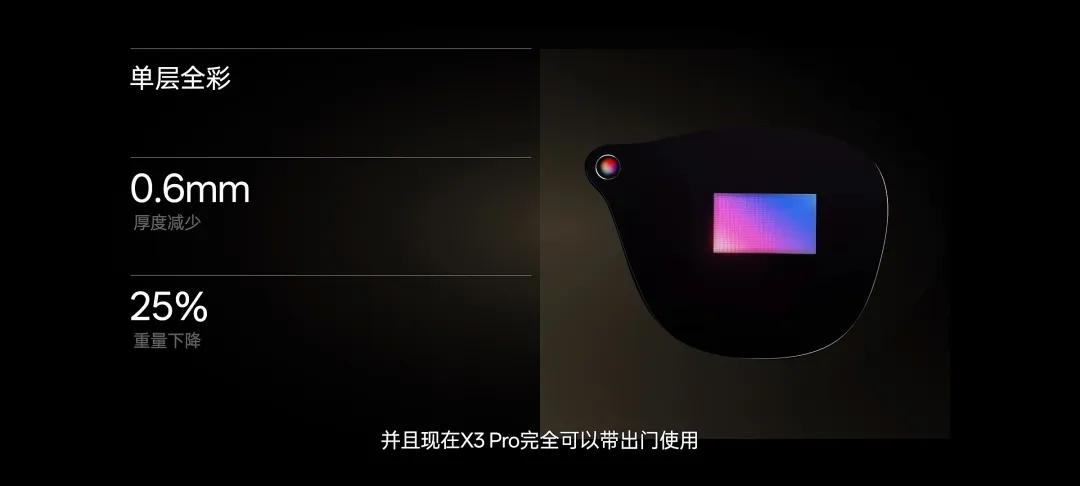 雷鸟 X3 Pro 宣称可能是全球首个量产光刻波导 AR 眼镜,搭载了新一代萤火光引擎,采用三色合色全彩方案,内置 JBD 定制红绿蓝三原色屏幕,配合 0.1cc 超小聚合 Cube 棱镜,实现了 1670 万色全彩显示输出,峰值入眼亮度 6000nits,平均入眼亮度 3500nits,光引擎大小 0.36cc。