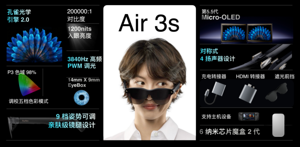 雷鸟Air 3s系列全系采用孔雀光学引擎2.0+第5.5代全新Micro-OLED屏幕,据了解,此次Micro OLED屏幕是由视涯科技供应,在画质精度、清晰度和亮度上实现三重飞跃,无论是宇宙星空的璀璨还是电影、游戏画面的细腻过渡,都能精准呈现。在延续上一代背靠背四扬声器系统基础上,雷鸟Air 3s Pro更是带来了全新的3D环绕音效系统,能让你听音乐,看电影,玩游戏,都能有极富空间感的环绕表现。