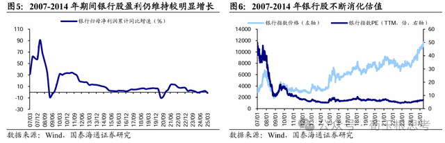 长期可观复利的前提:买入时估值水平要低。从更久远的时间维度进行回顾,银行股价也曾经历过较长时间的低迷,自2007年高点以来至2014年低点银行指数的跌幅达到54%。事实上银行股的股息率自2010年之后就已接近5%的水平,2007年至2014年期间其盈利增长速度尽管有所放缓、但增长的中枢值仍达28%。为何银行股在前期拥有较高的股息率、盈利也维持较高增长的情况下,其指数一直到2014年才开始明显走强?这背后的关键因素主要源于估值水平。银行股PE(TTM)在2007年高点时45倍,之后一路消化估值,09年高点时18倍,2014年低点时回落至4.5倍左右,PB分别是6倍、3倍、0.85倍,估值较高点萎缩约80-90%。当时足够低的估值给了银行股安全边际,可见,投资收益率实现长期复利的前提是买入时的估值水平低,否则较高的价格水平会在未来侵蚀投资收益率。